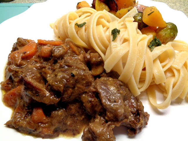 Stoofvlees in mosterdsaus maak je door riblappen in een saus van mosterd, cognac en bouillon te laten garen. En op het laatst wortelen en champignons erbij. Het lijkt misschien veel mosterd, maar het klopt echt. De Nederlandse vertaling heb ik overgenomen uit de Nederlandse site.
